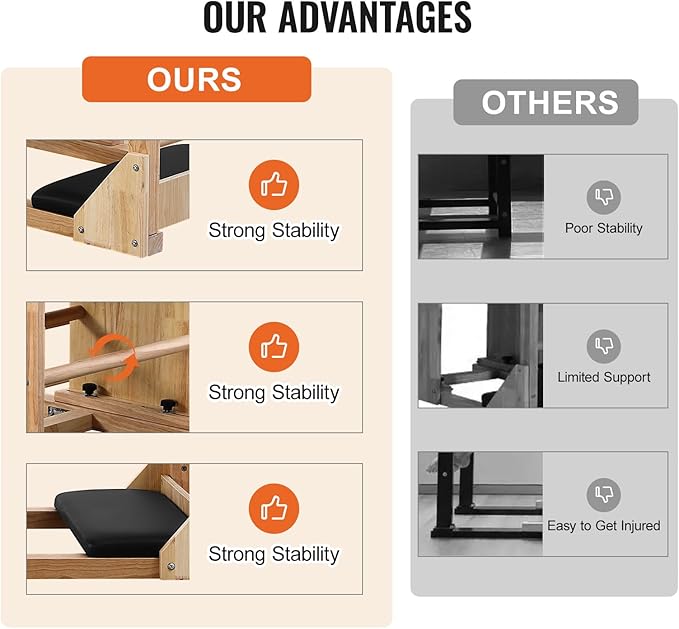 • 【Premium Rubber Wood】- The solid wood features good texture, making the Pilates Equipment not easy to crack and deform, good wear resistance, and high stability .Equipped with specific leather, which is tear-resistant, wear-resistant, anti-aging, breathable, and not stuffy. The high-density EVA foam padded inside leather, is moderately soft and hard. Making your workout comfortable.